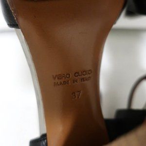 Pre-loved. Scuffs and darkening on wood. A few small tears in metallic leather along top edges of toes and heels. Labels on insoles are smudged. Does NOT come with box or dustbag.