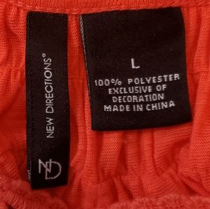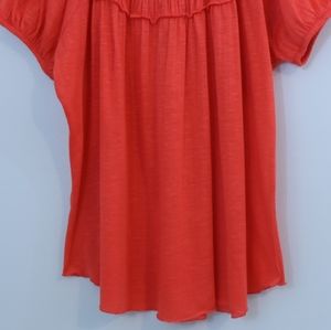 New Directions coral colored top with crochet lace design detailing around neckline and ruched gathered detailing around short sleeves. Excellent Condition.