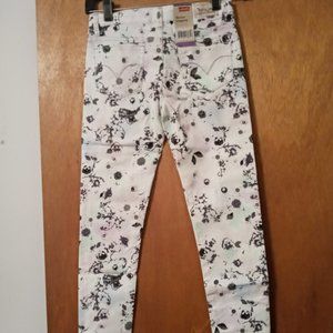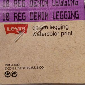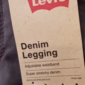 Girls, Levi’s Denim Leggings with adjustable waste band. They are super stretchy and super cute. The background is white with a splash of black, pink, and pastel watercolor.