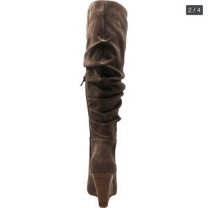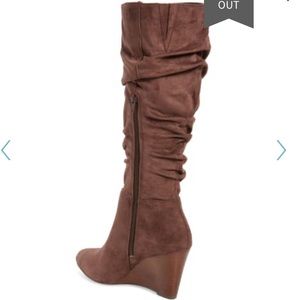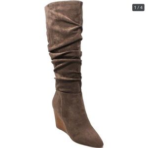 A slouchy constructed shaft details this wedge boot. Sizing: True to size. - Almond toe - Solid vamp - Side zip closure - Slouchy shaft - Solid color - Wedge heel - Approx. 13.75" shaft, 16" opening circumference - Approx. 3.5" heel