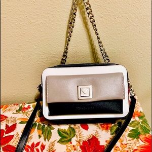 Gorgeous tri-colored (cream, taupe & black) smaller handbag. The chain you see is either beautiful decor or a smaller handle.