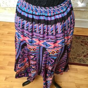 Mix Nouveau: Boho Skirt/Dress A-Line Geo-Print Medium. Multi-color geometric print in black, blue, pink, purple, yellow & orange. Elastic waist with simple knotted pull-ties. Looks adorable styled as a dress with belt, but can just as easily be worn as a skirt. Fully lined. Missing size tag, but measures out as a medium. Styled with belt, not included. EUC
