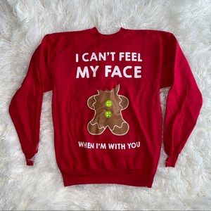 Red Crewneck Gingerbread Man Cartoon Christmas Sweater. Sweater cartoon has a gingerbread mans head “bit off” with the line “I Can’t Feel My Face When I’m With You”. Extremely comfy, inside of sweater is very soft.