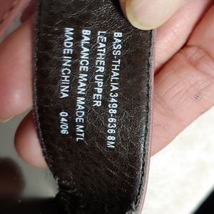 Mauve leather straps with wooden beads, and mauve plastic beads going up top of each foot. Has gold metal sequins going around front of shoe on insoles. Thick Leather insoles with rubber outer soles, and tiny little round heel. Super cute sandal. Wm. sz.8