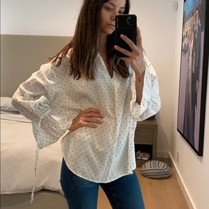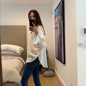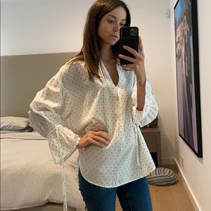 Super cool relaxed looking yet chic. Comfortable. Great detail on sleeves and nice pattern on the fabric. Wear for any occasion. Perfect condition. Not a bright white. More of a beige