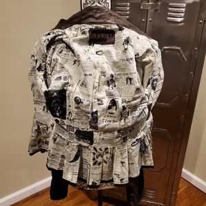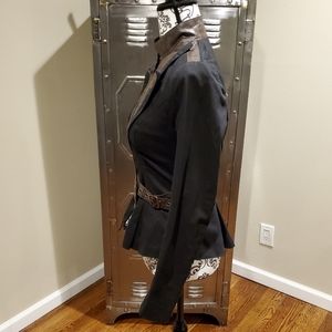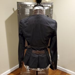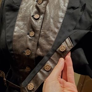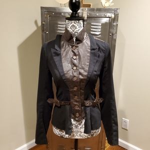 This piece screams steampunk. Black fitted jacket with veggie leather and brass metal hardware. Features custom gear shaped buttons Adjustable buckle straps on sides and rear. Pleating Details Gully Lined with Printed Voile