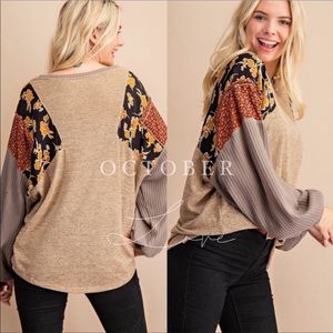 Mixed Long Sleeves, Means Four Different Fabrics Make Up This Definitely FALL Top. Leaves are Turning & Falling Off Trees. S-M-L