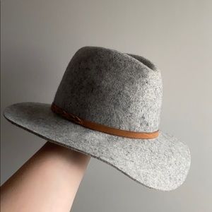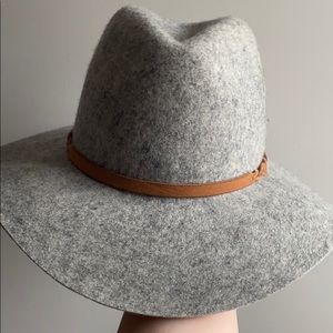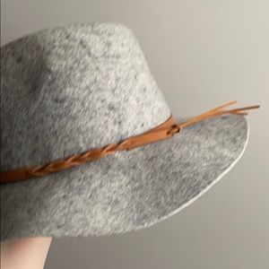 Worn once. This hat is too cute. Perfect for fall and winter. 100% wool. I have treated this with waterproofing spray so it can be worn in the rain!
