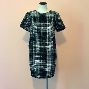 Like new! Banana Republic black and white tweed-pattern print shift dress. Perfect for fall with faux-leather accents on the sleeves and pockets. And it has pockets! Zipper in back. Fully lined. Measures 33” long in front and 34.5” long in back. Armpit-to-armpit Measures 20”