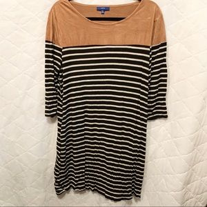 This dress is made with soft, moveable material, and the tan part at the top feels like suede. Best thing about this dress: it has pockets!!!