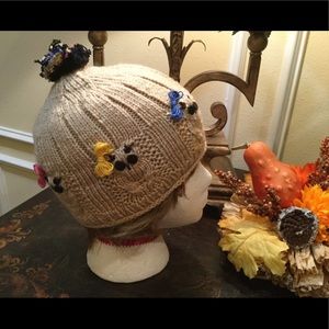 HAND MADE Knitted Beanie Owl bow accent and pom pom