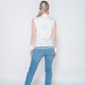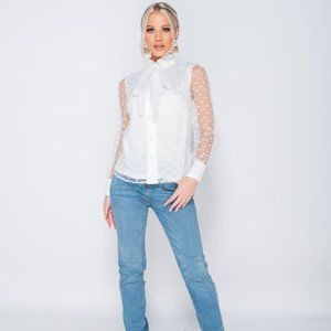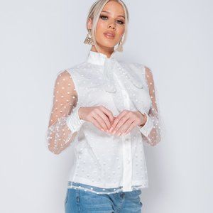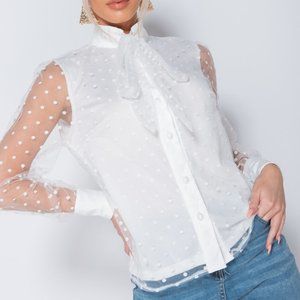 White polka dot long sheer sleeve high neck pussy bow tie blouse