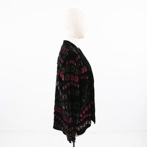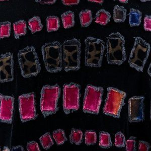 Vintage Chico’s mid-weight tunic top. Plush velvet, mandarin collar high neck. Button down or open cardigan w oversized boyfriend fit. Funky patchwork w subtle cheetah & prints. Rich stretchy comfortable for holiday parties or lounging! EUC.
