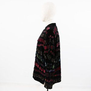 black multicolor artsy stripes printed eclectic cozy jacket sweater vtg party work creative layer shirt unique comfy loose relaxed tunic baggy velour 90s 80s