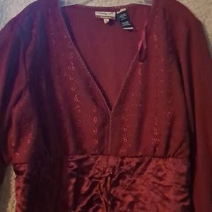 This deep blood red blouse is sexy yet covered the sex appeal comes from the coset detail in front. It also has a V-neck and sheer bodice with embroidery the sleeves are long with ruffles and the same embroidery. Runs a little small still in perfectly great shape