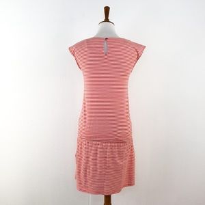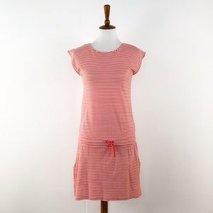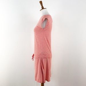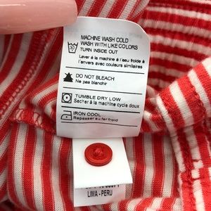 Red/Pink color with white stripes, elastic draw string waist band and side pockets. Cap short sleeves, round neck with keyhole opening at back.