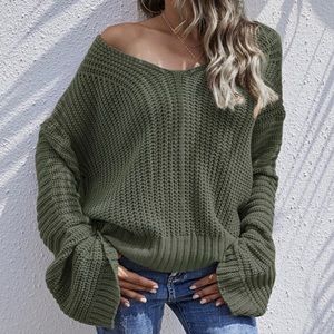 Green chunky knit oversized drop off shoulder knit sweater