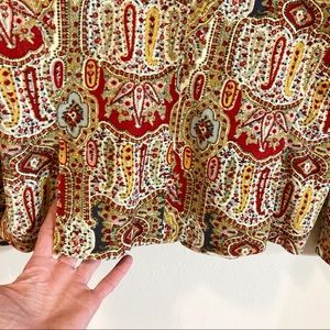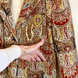 Super soft corduroy blazer in fall colors with intricate pattern. Blazer has 2 front buttons and 4 on cuff, breast pocket and 2 waist pockets. Size 20, great condition.