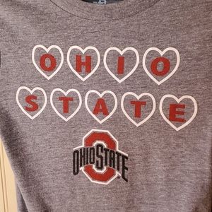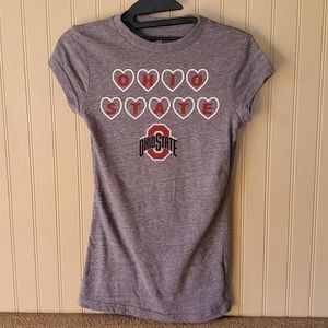 Ohio State girls tee. Size large 14. Gray with red and white colors. In good pre-owned condition. Shows some wear but has lots of wear left. Free of rips, tears and stains. Smoke-free home.