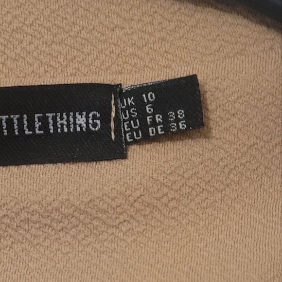 Camel color textured fabric, classic collar with a tie belt waistline.