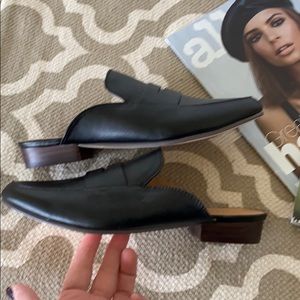 “J. Crew” backless, black loafer mules, size 6; NWOT; Please note the right shoe has a small scratch on top(see last picture).Marks on bottoms from store try ons.NWOT