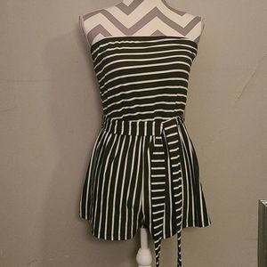SHEIN romper, size medium. Never worn, in bag it arrived in (didn't have tags or they would be on). Black and white. Pull on/off, no zipper or buttons. Tie belt. Polyester.