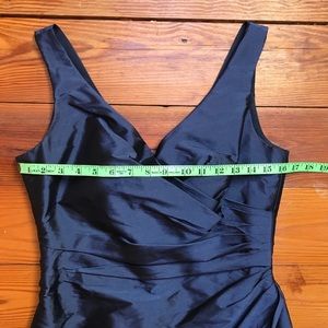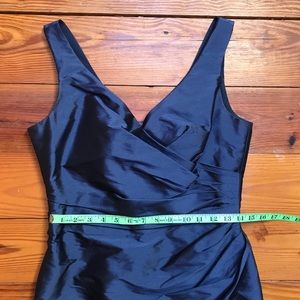 100% Polyester, Gorgeous side gathering. Shoulders: 13”, Bust: 16.5”, Waist: 14”, Hips: 18”, Length: 37.5”.