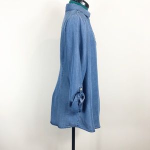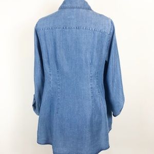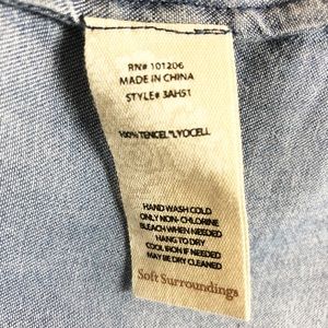 Vintage-washed Tencel Tunic- ultra-softness and a bit of an edge, it features an asymmetrical point hem and fuss-free fit.. Crossover front with asymmetric pearlescent buttons, wrap style. Interior tie to keep in place.