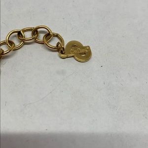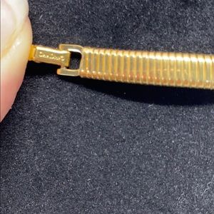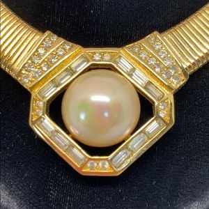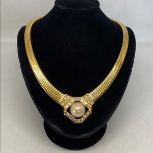 This beautiful gold plated necklace is circa 80’s-90’s. It has a large center faux pearl (16mm) that has a slight iridescence. The center section measures 1 1/2” and the pearl is accented by Swarovski crystals. The chain is slightly stretchy, which allows it to hug your neck nicely. It is 16” long with a 2” extension. Both the fold over clasp and the CD charm are signed Chr. Dior. The piece is in excellent condition, only minor flaw is a slight rub on the pearl, only noticeable under magnification.