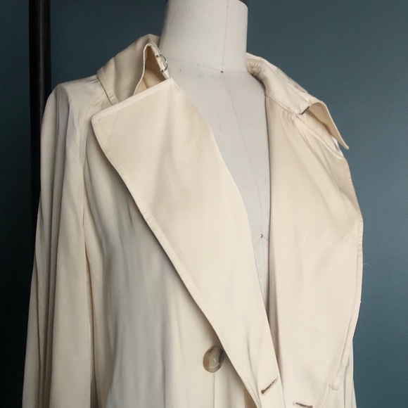 Carson Trench Coat is a drapey, relaxed fit trench coat with lots of movement. It’s cut from a smooth fluid fabric with a slight sheen. Lightly worn. Looks new.