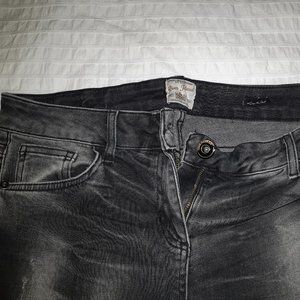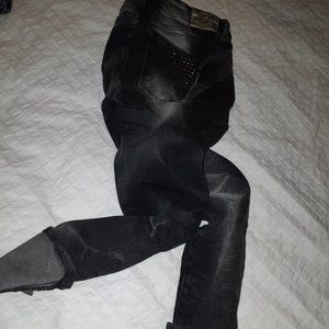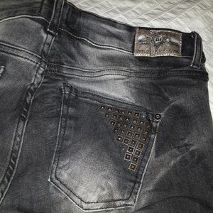 stretch denim with distressed pattern on front & back with metal studs on pocket