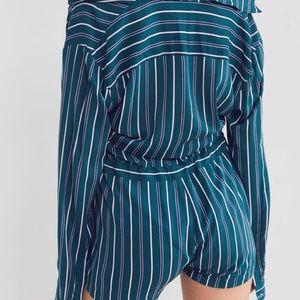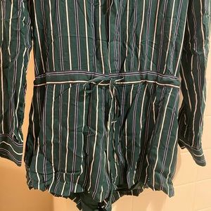 Beautiful emerald green striped long sleeve romper from Urban Outfitters great for the upcoming fall season! Brand is Urban’s Silence and Noise. Size is a small but can also fit a medium. Great paired with tights and a leather jacket! Worn once.