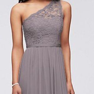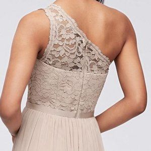 Illusion one shoulder corded lace bodice with ribbon belt at waist.
