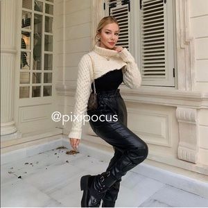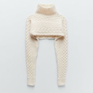 High neck collared arm warmer sweater with long sleeves. Soft, stretchy knit fabric. Cropped length.