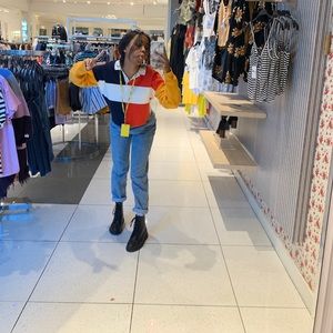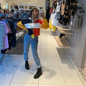 This color-block long sleeve is red, white, navy, and mustard. It is a size MEDIUM and fits like a crop top; can be styled with boyfriend jeans or high wasted jeans :)
