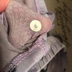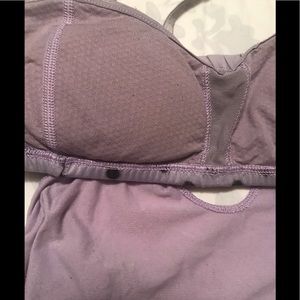 Lavender & blk polka dot Lululemon workout tank top. Removable bra pads. Straps can crisscross or straight. Non-adjustable. Keyhole hole in front. Cuffed hemline. No care tag. 12 in pit to pit. 27 in L w/ straps. 20 in L without straps. Hip is 16 in wide. Fabric has stretch. Top bra is very tight w/ good support. Some minor wear: Pilling on interior. 1 small pull & tiny bleach spot on lower front. 1 lose thread in back bra area’s interior. None are noticeable. See photos.
