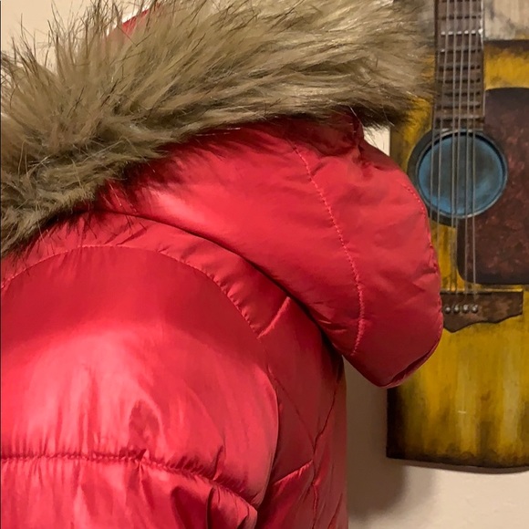Size 13 Hoodie Girls Jacket/Fur Coat. In great condition, has a slight tear on bottom left. Overall great coat for girls.15 across shoulders. 18 across arm pit. 27 front . Arm inseam 17