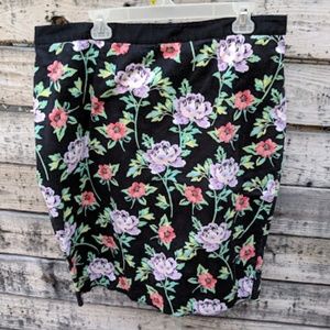 Dorothy Perkins fun floral pencil skirt. The skirt is black with red/pink and purple flowers and green leaves. It has a zipper and button closure in the back. There is also a vent in the back. The skirt isn't super stretchy. The bottom hem of the skirt is the sewed edge, so it can easily be shortened if needed. The tag says it's a UK 20, which is a 18 in the US.