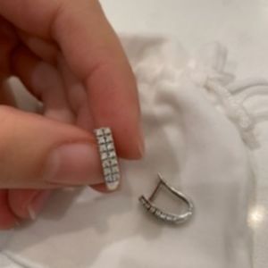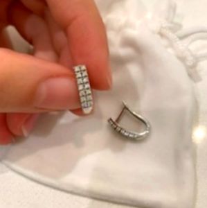 Silver plated earrings with rhinestones. These beautiful earings are the compliment to any outfit! The last picture shows that one of the earings are missing 2 little stones which does not really show when you are wearing them. The price reflects the damage.