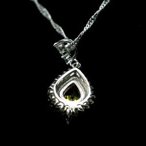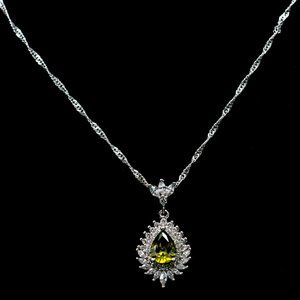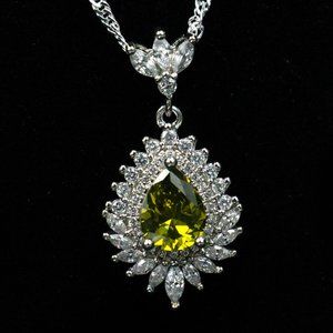 Necklace features an elegant pear shaped Brazilian Peridot stone in the center of a sterling silver pendant. The Peridot stone is encompassed by round white topaz stones with marquee cut stones fanned out at the bottom half of pendant. Bail is constructed of three marquee cut stones leading to one round stone. The 16" long chain is , 1.5 mm thick in a water wave design. The pale green peridot stone is often called the evening emerald You will receive your necklace in a soft velvet gift pouch.
