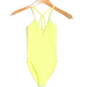 Slender straps that echo the beautiful design in back cross the deep neckline of this dance-ready ribbed bodysuit.
