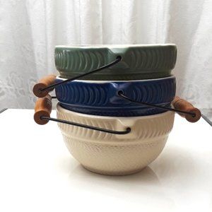 Stoneware Ribbed Bowl with Wooden Handle, Set of 3. In excellent condition!