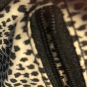 Animal print fabric lining. Inside zip pocket. Outside zip pocket in front.