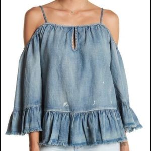 Women’s BLANKNYC off the shoulder denim flutter top, distressed denim with flutter sleeves, adjustable straps, size XS