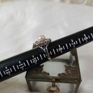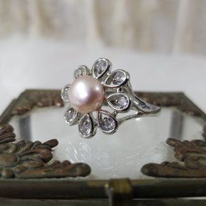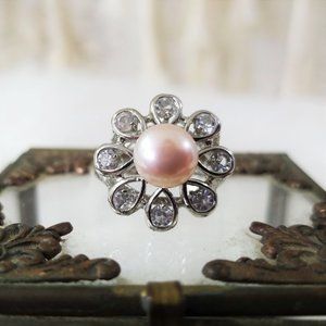 Stunning silver ring with a 9mm peach saltwater pearl and simulated diamonds making a flower.