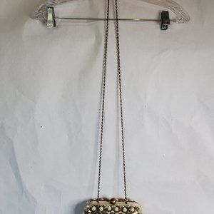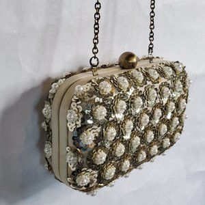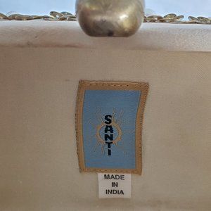 Santi vintage sequin beaded clutch bag. Hide away long chain strap. Made up of sequin and beads. Almost looks like a floral design out of sequins. Imported from India. Pre owned, in great vintage condition. The circle at the top is the clasp / closure. Great for going out! This measures 6 by 4 inches. The chain laid flat measures about 25 inches long.