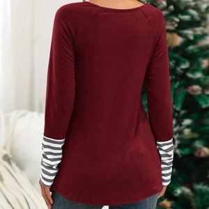 Perfect festive, casual and chic shirt for this Christmas Holiday season! Burgundy long sleeve shirt with "Baby It's Cold Outside" embellished with shimmering GOLD snowflake, with fashionable gray and white striped bottom sleeve as shown. See Size chart for measurements. 65% Polyester/35% Cotton.
