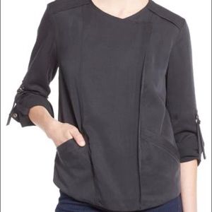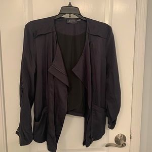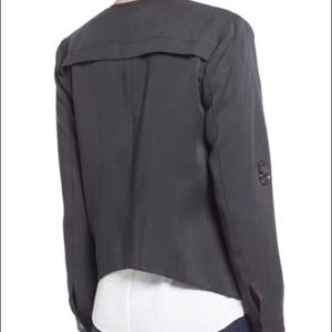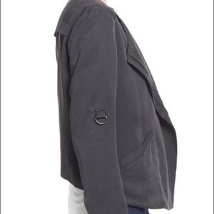 Clean styling defines an ultrachic collarless jacket woven from supersoft fabric. Wear it open for a casual, drapey look, or zip it up to look elegantly refined. The long roll-tab sleeves are equally versatile, with utilitarian D-ring hardware to secure them for more casual occasions.