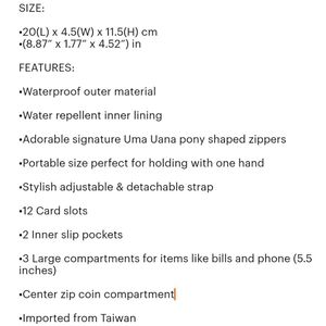 This is a high quality, brand name Uma Hana, Crossbody Shoulder Clutch Wallet. It is fashionable and functional with a waterproof outer material and a water repellent inner lining.