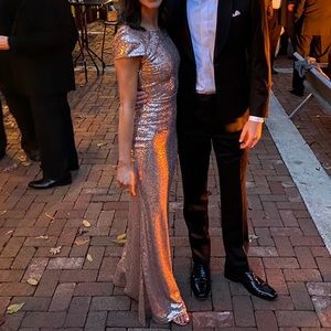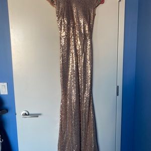 Rose gold sequin gown with cowl neck in back. Like new, I have only worn this once to a wedding and received many compliments. I do not have measurements as I purchased it online and then had it altered- I am 5”4 inches tall and 120lbs and the dress fit perfectly. Front padding sewn in.